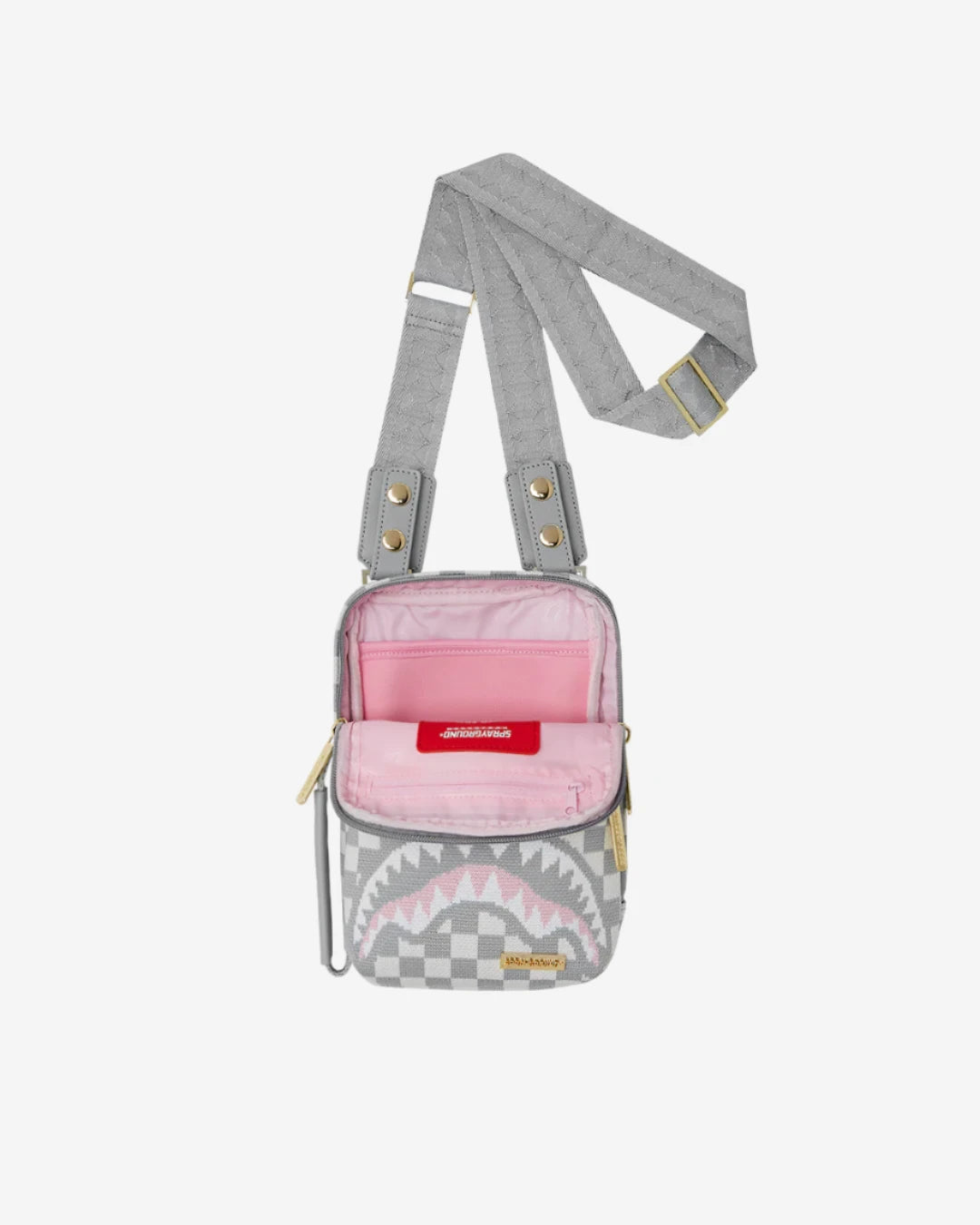 The Sprayground Knit Sharks in Paris in Cream OG Sling combines luxury-inspired design with a streetwear edge. Featuring the Sharks in Paris monogram in a cream knit texture, this compact crossbody sling is perfect for carrying your essentials in style while keeping your hands free.