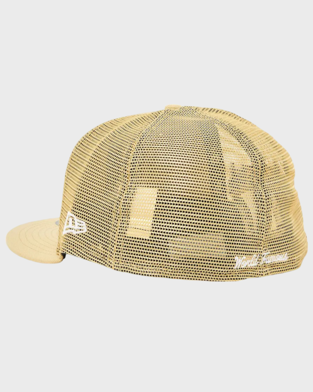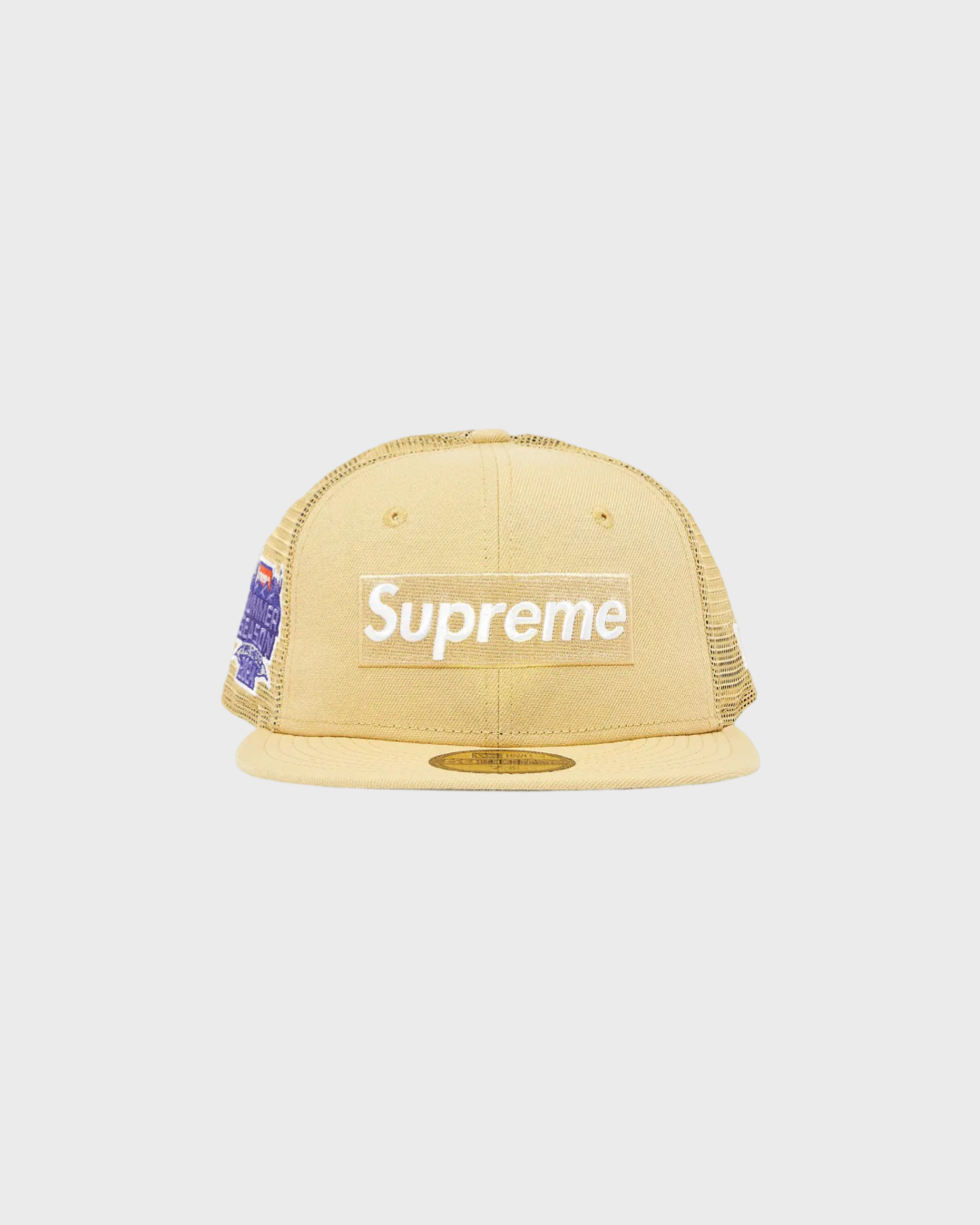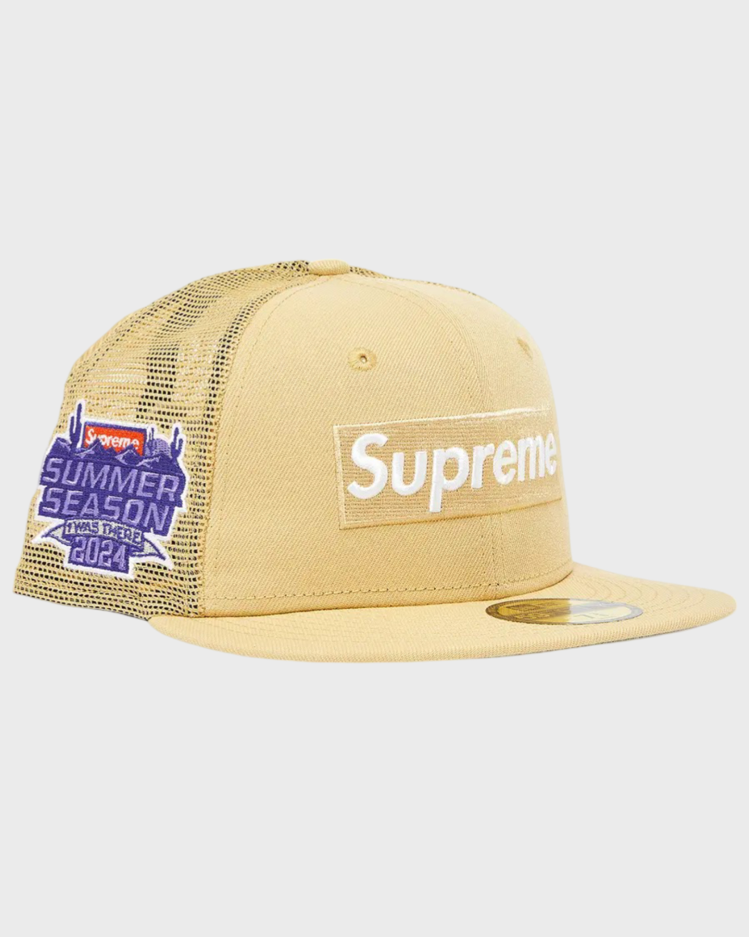 The Supreme Box Logo Mesh Back New Era Cap from the Spring/Summer 2024 collection was released on April 4, 2024. It features a poly New Era® 59FIFTY baseball hat design with a mesh back and embroidered logos on the front, sides, and back.