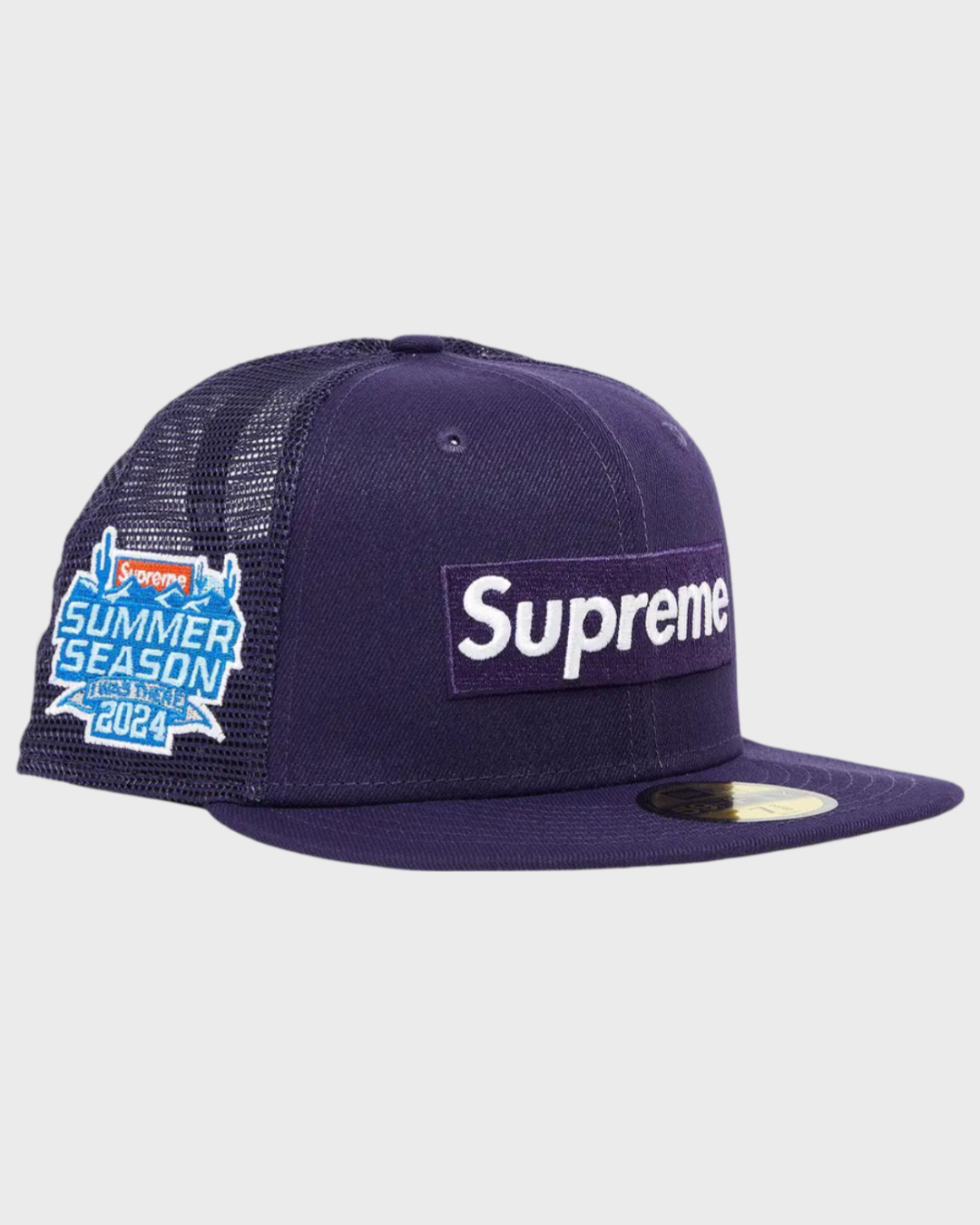 The Supreme Box Logo Mesh Back New Era Cap from the Spring/Summer 2024 collection was released on April 4, 2024. It features a poly New Era® 59FIFTY baseball hat design with a mesh back and embroidered logos on the front, sides, and back.